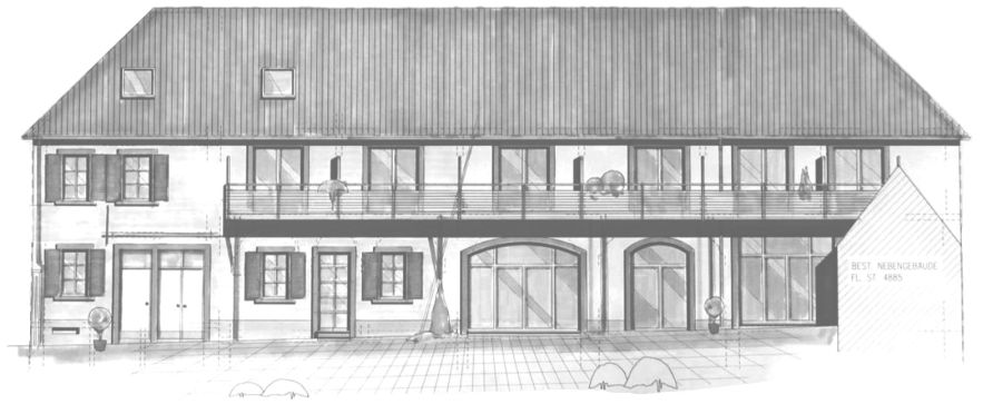 Das langgestreckte, mit regionaltypischem Sandstein errichtete Gebäude diente ursprünglich der Vieh – und Lagerhaltung. Die in dieser Scheune integrierten Ställe bestehen aus – heute noch erhaltenen – Kreuzgewölben aus dem 19. Jahrhundert. Im östlichen Teil befand sich die Kelterhalle, in der über lange Jahre hinweg von unseren Pfälzer Vorfahren Wein erzeugt wurde.